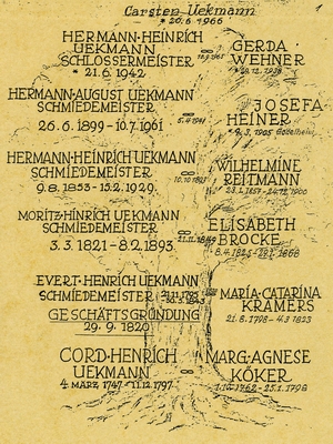 In vierter Generation übernahm Schmiedemeister Hermann August Uekmann, das Erbe und erweiterte sein damaliges Arbeitsprogramm um ein Einzelhandelsgeschäft. | ||||||||||||||||||||